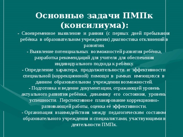 ПМПК — психолого-медико-педагогическая комиссия. Это специальная комиссия, которая проводит комплексное обследование детей и подростков с особенностями физического и психического развития, а также отклонениями в поведении.